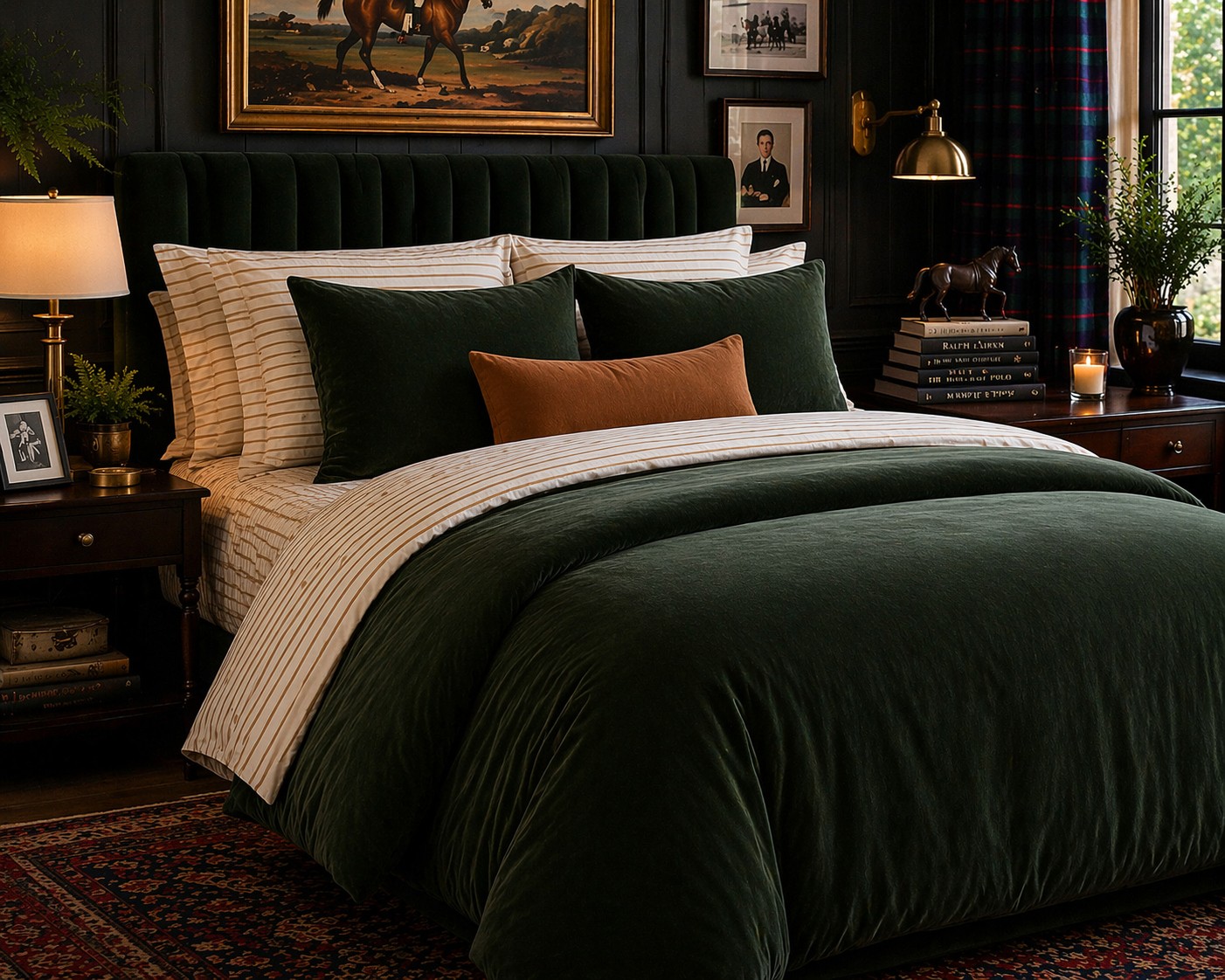 Ralph Lauren bedding is all about classic tailoring, rich texture, and timeless color. For this look, I paired a forest geen comforter set with beige striped sheets and a soft cognac lumber pillow to give the bed that warm, collected, heritage-inspired feel Ralph Lauren does so well.