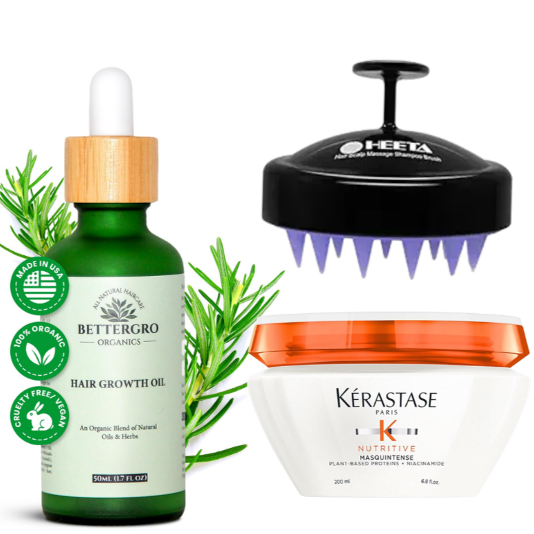A blend of rosemary and amla oil are the key ingredients. I massage this into my scalp for 5 minutes once a week. I then put Kerastase’s hair mask on my ends and let it sit for 3 hours. Kerastase is my go-to for hair care. She is expensive, but she is worth it. Stay conistent, and I promise you amazing results!